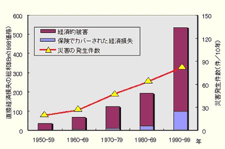 Socio-economic impact by disasters grows continuously in recent years. Comparing the data of the 1990s to these of the 1960s, the total economic loss rises 8.6 times and the insurance payment rises 16.1 times although the number of disasters are increased by 3.2 times. These facts imply :